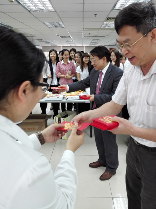 吴列进董事长、梁达明副董事长为第一季度生日的员工派发慰问金