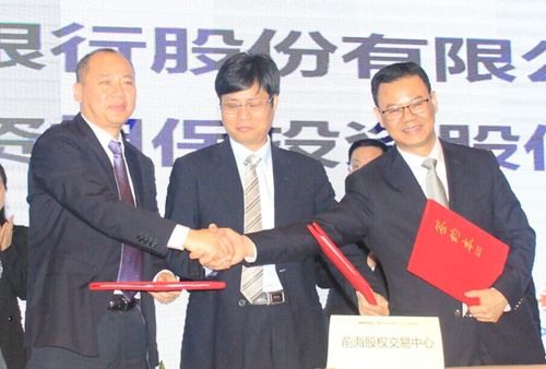 中盈盛达董事总裁谢勇东(右)与前海股权交易中心常务副总裁陈俊生(中)、华兴银行佛山分行行长崔健(左)在嘉宾见证下签署战略合作协议