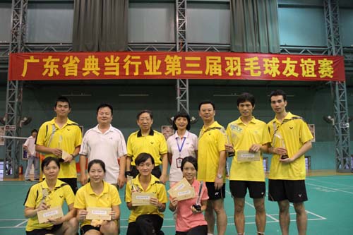 2012年11月9日,广东省典当行业协会在广州弘扬羽毛球馆举办了“广东省典当行业第三届羽毛球友谊赛”。中盈盛达吴列进董事长、谢勇东总裁等高管率领公司羽球精英积极参赛,一举夺得了男单、男双、女双、以及混双四项赛事冠军。最终我司凭借四金一银的出色战绩获得了“最佳团体奖”。比赛过程中,我司参赛队员全情投入、沉着应战,始终秉持“友谊第一,比赛第二”的原则。通过本次活动,展示了中盈盛达人健康积极的精神面貌,同时加强了省典当协会成员之间的沟通交流。