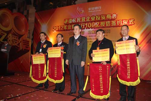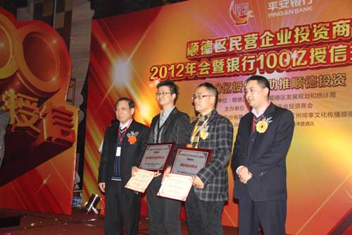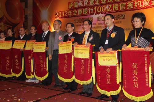 12月20日下午,由顺德区民营企业投资商会主办的投资商会2012年会暨银行100亿授信签约仪式活动在顺德喜来登酒店宴会厅隆重举行,出席该活动的有顺德区委副书记、区长黄喜忠和200多家会员单位代表。我司吴列进董事长作为商会副会长参加了活动,并代表公司上台领取了“商会优秀会员”和“2012年度优秀投资项目”的奖状和锦旗。