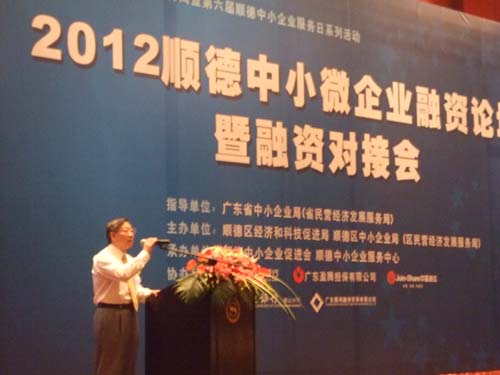 8月20日,由顺德区经济促进局、顺德区中小企业局主办,顺德区中小企业促进会、顺德区中小企业服务中心承办的2012顺德中小微企业融资论坛暨融资对接会在顺德喜来登酒店隆重举行。顺德经促局在活动现场与各金融机构签订中小微企业融资服务合作协议,同时启动顺德区“银企直通车”服务平台。中盈盛达吴列进董事长和华南理工大学崔毅教授应邀出席活动并担任演讲嘉宾,为中小微企业融资问题把脉开方。