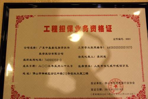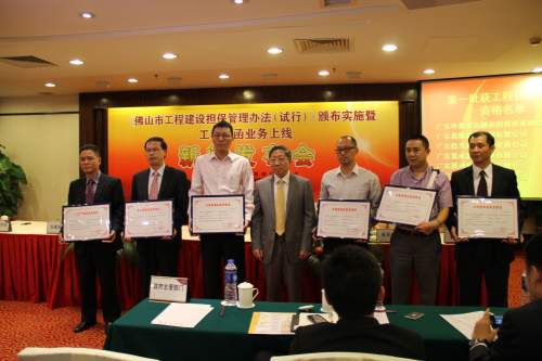 佛山市信用担保协会会长、中盈盛达吴列进董事长为首批获得工程建设担保资格证的担保公司颁发证书