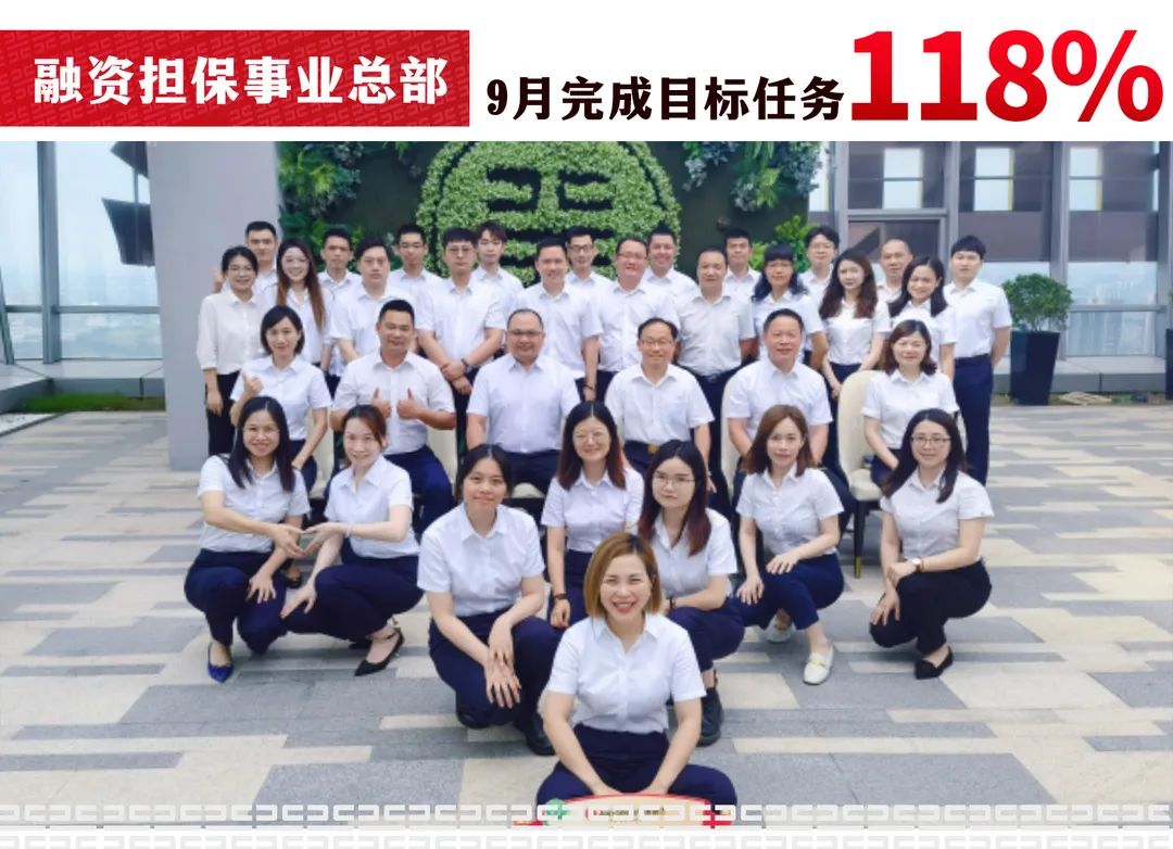 融资担保事业总部完成目标任务118%。融资担保事业总部贯彻 “稳字当头,稳中求进”的工作思路,全员保持乐观进取的敬业精神,在项目上报、审批、出款等各个环节均做到部门前中后台紧密合作,把风险控制放在首位,同时铆足干劲推动业务进度,顺利完成9月目标任务。