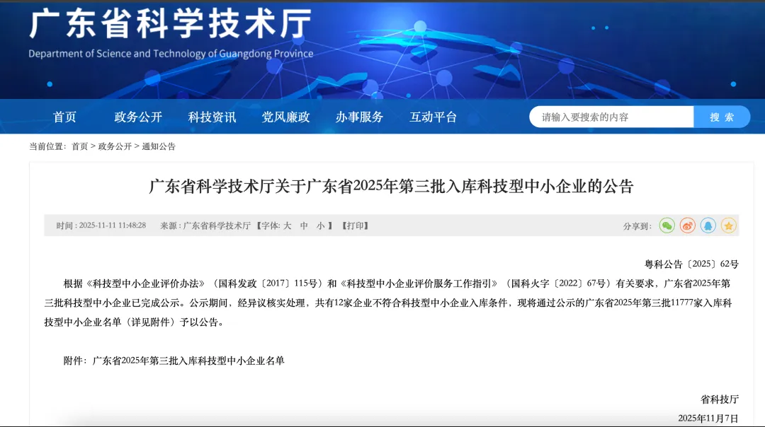 近日,广东省科学技术厅公布了2025年第三批入库科技型中小企业名单,数科公司顺利通过入库认定,成为连续5年入选名单的科技型中小企业之一。这标志着官方对数科公司科研实力的肯定,在创新能力方面更是给予充分的认可。