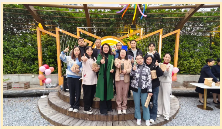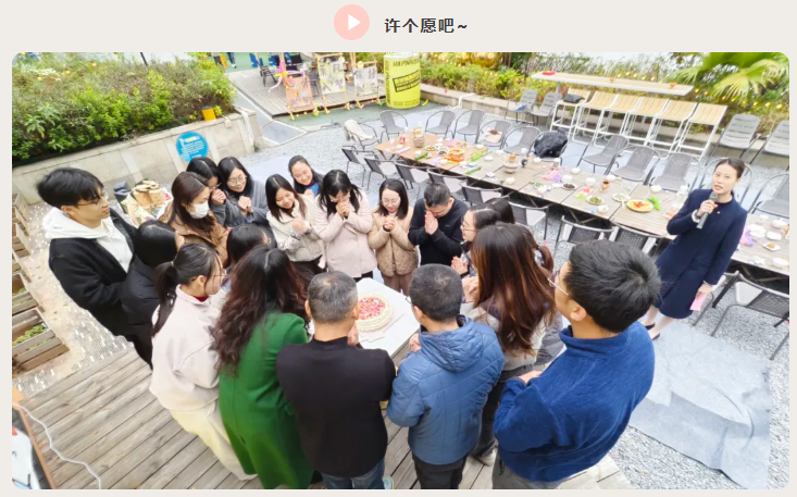 活动设在公司附近的一处空中花园。活动现场露营帐篷、茶桌错落排布,暖光点缀其间,氛围感十足。暖场环节,在工作人员的指导下,寿星们手持彩绳绒线,专注学习手工技巧,互帮互助间,纷纷编织出形态逼真的绒花,尽享手工惬意。随后,生日仪式、围炉煮茶与烧烤畅吃依次举行。露营茶桌旁,炉火暖心,红枣桂圆煮出奶茶飘香,寿星们围坐品茗、畅谈心声;烧烤区烟火升腾,鲜嫩烤肉与爽口蔬菜轮番上阵,舌尖尽享美味。而在趣味互动环节,寿星们则随机分为两组,在打卡拍照、肢体猜词、颜色读字等游戏中使尽浑身解数。大家默契配合、踊跃参与,夸张的肢体语言与快速反应的竞技姿态引来现场笑声不断,大家在协作中拉近彼此距离。