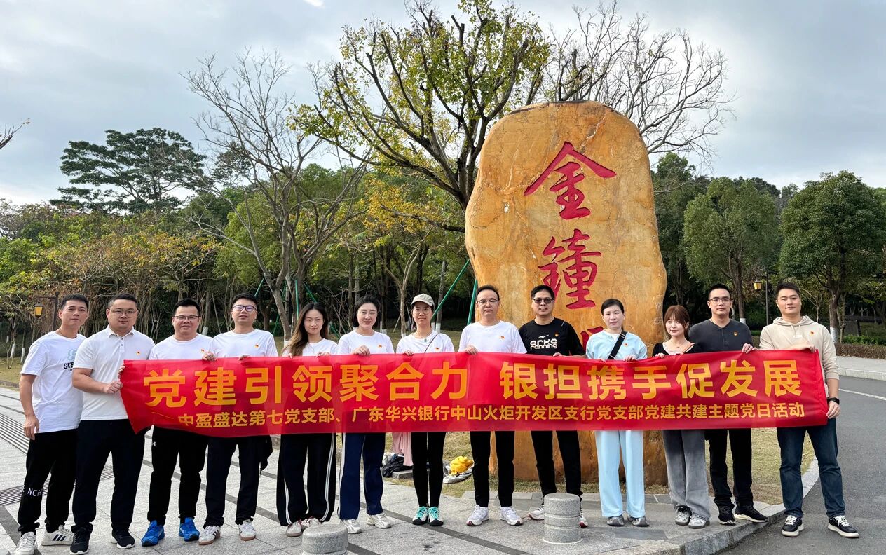 为深入学习贯彻习近平新时代中国特色社会主义思想,全面落实新时代党的建设总要求,进一步强化党建引领作用,搭建银担合作交流桥梁,凝聚服务实体经济发展合力,12月20日,中盈盛达第七党支部联合广东华兴银行中山火炬开发区支行党支部,前往中山市金钟湖公园开展“党建引领聚合力 银担携手促发展”党建共建主题党日活动。
